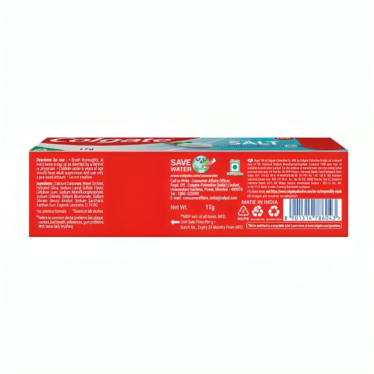 Colgate Active Salt is an anti-cavity toothpaste with the goodness of salt and minerals which help fight germs. Refreshing minty flavour gives fresher breath when used as directed for oral hygiene. Colgate Active Salt’s unique formula helps fight germs and provide you with healthier and cleaner teeth. Brush twice a day with Colgate Active Salt toothpaste as recomMended by dentists. Colgate is India’s No. 1 brand recomMended by Dentists and offers unique oral hygiene solutions to ensure complete protection against germs and plague build-up.