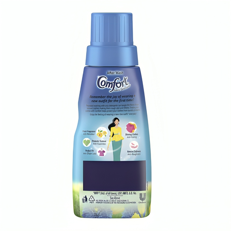 Want your clothes to shine like new every day? A small step of Comfort After Wash Fabric Conditioner Morning Fresh (Blue) 220 ml gives your clothes unbeatable shine, that detergent alone can’t deliver. Even if you use the best detergents, repeated washing can tangle cloth fibres, making them rough, dull & lifeless. Taking a small step of Comfort After Wash Fabric Conditioner Nourishes the cloth fibres damaged by detergent, giving them new like shine even over repeated washing. Not only shine, our range of fabric softeners gives visible softness to your favourite clothes while also delivering a long lasting freshness. How to Use: BUCKET WASH: After washing your clothes with laundry detergent, pour ½ a cap of Comfort in a bucket of water, and soak your clothes for 5 mins. Remove and dry them. Don’t rinse the clothes again. SEMI-AUTOMATIC: Wash your clothes with detergent as usual. Pour 1 cap of comfort in machine tub in clean water during the last rinse cycle. TOP LOAD: If your machine has a softener compartment, pour 1 cap of comfort at the start of wash cycle. Otherwise, pour 1 cap of comfort in machine tub during last rinse cycle. FRONT LOAD: Pour 1 cap of comfort in the softener/conditioner compartment at the same time as you add detergent. Add a small step of Comfort Morning Fresh to your regular laundry routine and experience unbelievable shine, visible softness and freshness. Pick up your favourite Comfort today.