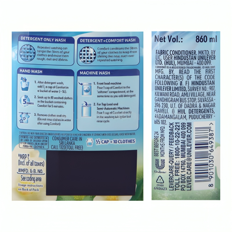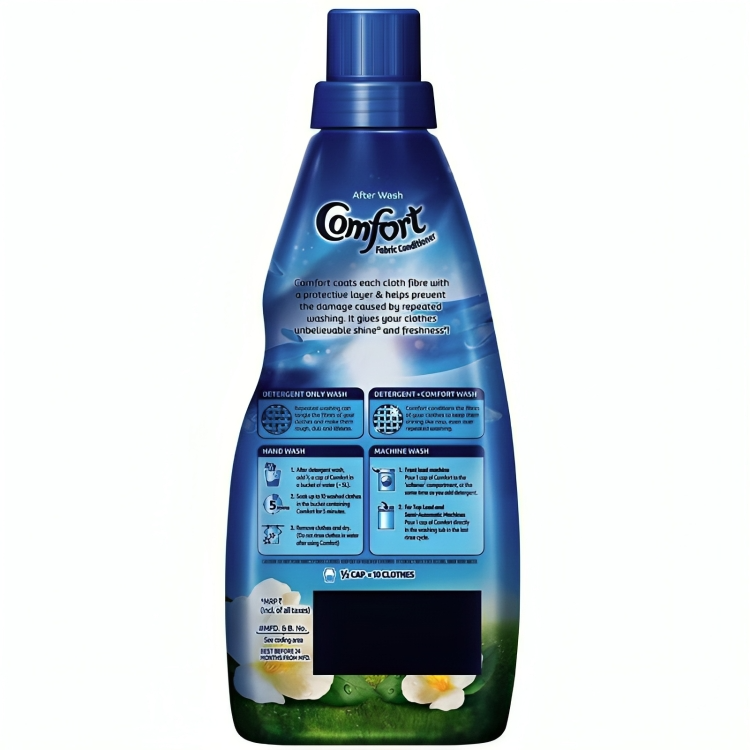 Want your clothes to shine like new every day? A small step of Comfort After Wash Fabric Conditioner Morning Fresh (Blue) 860 ml gives your clothes unbeatable shine, that detergent alone can’t deliver. Even if you use the best detergents, repeated washing can tangle cloth fibres, making them rough, dull & lifeless. Taking a small step of Comfort After Wash Fabric Conditioner Nourishes the cloth fibres damaged by detergent, giving them new like shine even over repeated washing. Not only shine, our range of fabric softeners gives visible softness to your favourite clothes while also delivering a long lasting freshness. How to Use: BUCKET WASH: After washing your clothes with laundry detergent, pour ½ a cap of Comfort in a bucket of water, and soak your clothes for 5 mins. Remove and dry them. Don’t rinse the clothes again. SEMI-AUTOMATIC: Wash your clothes with detergent as usual. Pour 1 cap of comfort in machine tub in clean water during the last rinse cycle. TOP LOAD: If your machine has a softener compartment, pour 1 cap of comfort at the start of wash cycle. Otherwise, pour 1 cap of comfort in machine tub during last rinse cycle. FRONT LOAD: Pour 1 cap of comfort in the softener/conditioner compartment at the same time as you add detergent. Add a small step of Comfort Morning Fresh to your regular laundry routine and experience unbelievable shine, visible softness and freshness. Pick up your favourite Comfort today.