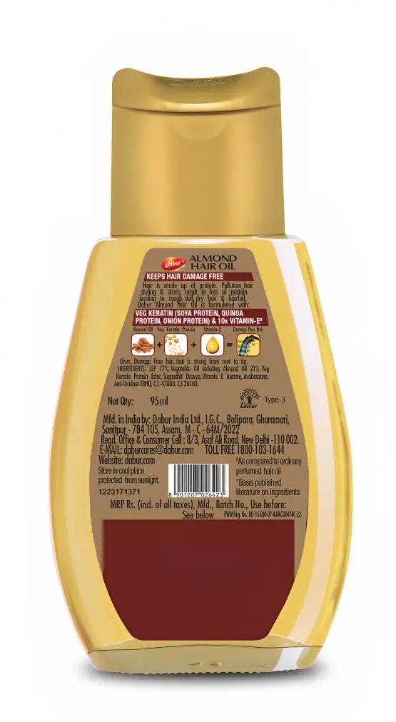 Enriched with the goodness of Almond protein and Vitamin E, regular use of Dabur Almond Hair Oil is essential for healthy, strong and damage Free hair. It has twice the amount of Vitamin E compared to other leading almond hair oil brands.