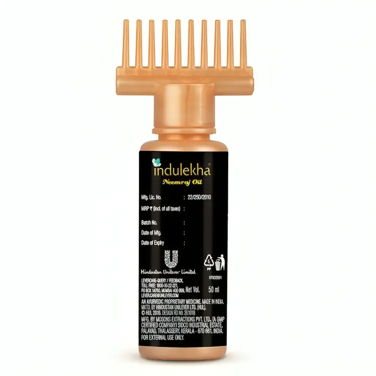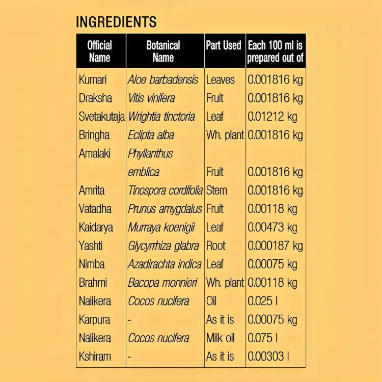 Indulekha Bringha Oil is an Ayurvedic proprietary medicine recomMended for the regulation of hair and scalp conditions like hairfall, dandruff etc. The excellent action of Indulekha Bringha oil is due to the actions of It’s ingredients and the special manufacturing procedure of the base oil.During the production of Indulekha Bringha Oil, the Swethakutaja leaves are dipped in pure coconut milk oil (prepared by cold process technology). This prolonged blending process helps to extract the entire medicinal quality of the leaves and thus makes it an effective ingredient of Indulekha Bringha Oil.Active ingredients along with the base oil create an excellent combination that is extremely beneficial for hair.• SvethakutajaIt has anti-inflammatory and anti-dandruff properties. Also known for It’s antimicrobial properties and hence used for all types of psoriasis (skin disorder) and dandruff.• Aloe veraAloe vera contains enzymes which repairs dead skin cells on the scalp. It promotes hair growth, prevents itching on the scalp, reduces dandruff and conditions your hair. it rejuvenates the hair with It’s own nutrients, giving it more elasticity and preventing breakage.”• NeemProvides anti-protozoal, antioxidant, anti-inflammatory and antibacterial properties. Neem helps to treat these conditions of hair and cleanse the scalp for healthy hair growth.• BringharajHelps to improve hair growth and colour. It’s extracts rejuvenates hair keeping the hair lustrous, dark and healthy. It also helps to nurture and condition hair.• AmlaRichest source of Vitamin C & antioxidants. It helps maintain youthful hair color and retards premature graying and supports the strength of the hair follicles.• Virgin Coconut OilVirgin coconut oil is extracted by the cold compression method. It is higher in vitamin content, antioxidants, minerals, fragrance and even the amount of protein.
