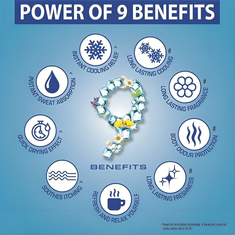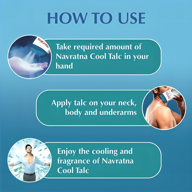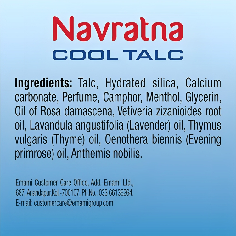 Enriched with the goodness of Menthol, the Icy cool formula of Navratna Cool Talc gives instant cooling relief while its refreshing fragrance not only revitalizes senses but also gives long- lasting fragrance.