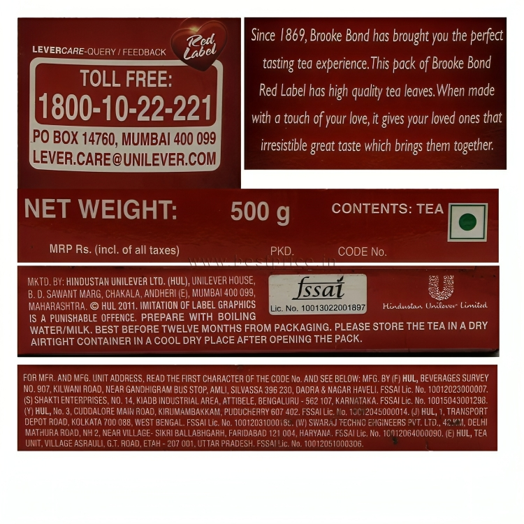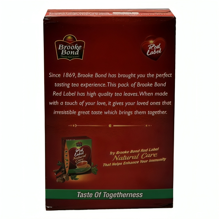 Brooke Bond Red Label is one of India’s largest selling packaged tea brands. Brooke Bond Red Label Tea is a blend CTC tea with best quality leaves; processed in the unique Brooke Bond Tea Excellence Centre .Since 1869, Brooke Bond has brought you the perfect tasting tea experience with the best-chosen leaves. It was in 1903 that Brooke Bond launched “Red Label”. That is when Brooke Bond Red Label started worked to create India’s one of most favourite beverage “chai”. Every cup of Red Label is brewed with the best-chosen tea leaves; that ensure your tea has strength, rich colour, and refreshing taste. We believe our tea has the taste of togetherness that gives that perfect taste, colour and irresistible aroma. Red Label is all about coming together over a warm cup of tea with everyone arounds. It is the “Swad Apnepan ka (Taste of Togetherness). Brooke Bond Red Label stands for inclusiveness and making world a better place one cup at a time.. Enjoy the great tasting range from Red Label Core and Red Label Natural Care; that has a mix of 5 Ayurvedic ingredients namely Tulsi, Ashwagandha, Mulethi, Ginger and Cardamom. Red Label Natural Care is clinically proven to enhance immunity and help you fall ill less often.